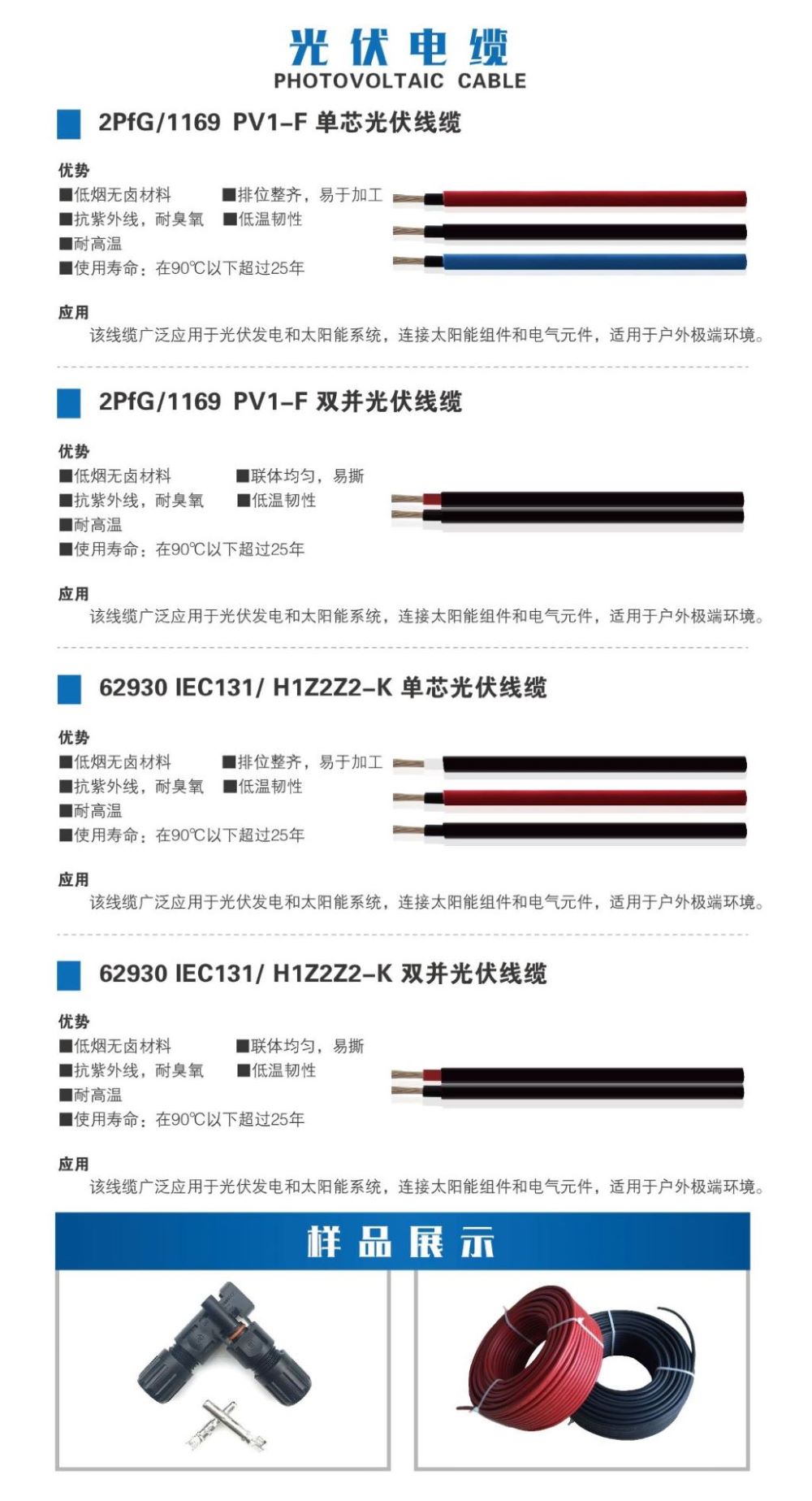 直流光伏线缆用于光伏发电系统连接电缆,如组串之间及组串至直流配电箱(汇流箱)之间的并联电缆,直流侧的光伏组件与组件之间的串联电缆、组串之间及组串直流配电箱(汇流箱)之间的交联电缆和直流配电箱至逆变器之间的电缆,也可适用于逆变器与输电网间连接用的交流应用电缆。